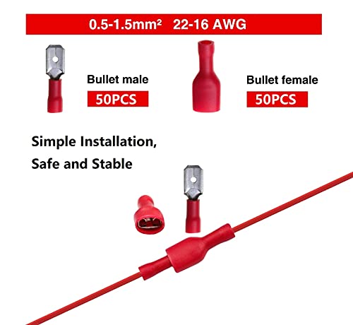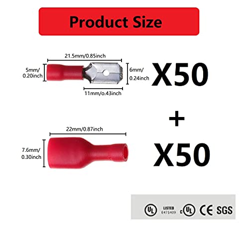 Shentian - 100 capicorda, 50 rossi piatti, 50 manicotti - Dimensioni spinotto 6,3 mm, connettore isolato per auto a compressione