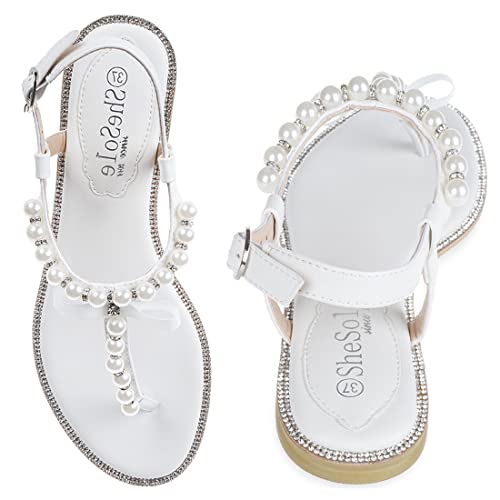 Perline e strass. La cinghia a T in PU è ornata con perle e diamanti, sembra il guanto e riutilizzabile. I sandali bianchi presentano anche un diamante parkly intorno alla suola intarsiata.