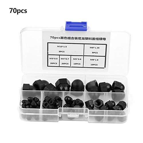 Shexton Dadi a ghianda, 70 Pezzi M3/M4/M5/M6/M8/M10 Kit Dado a ghianda in Nylon Dadi esagonali con Cappuccio a Testa bombata(Nero)