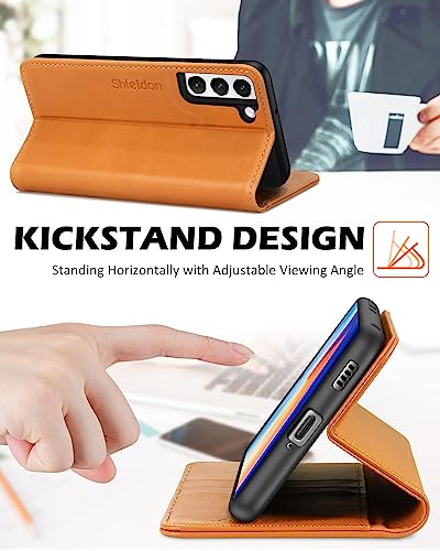 SHIELDON Custodia per Galaxy S22, Cover Portafoglio Vera Pelle Antiurto TPU Blocco RFID Slot Schede Cover Cavalletto Flip Caso Magnetico Protezione Compatibile con Galaxy S22 (6,2" 2022), Marrone