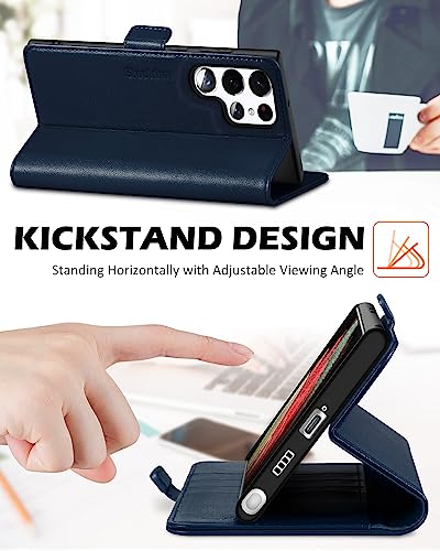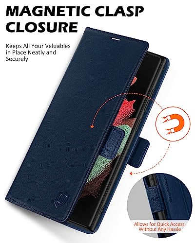 SHIELDON Custodia per Galaxy S22 Ultra, Cover Vera Pelle RFID Blocco Slot Schede Portafoglio Cover Cavalletto TPU Antiurto Chiusura Magnetica Compatibile con Galaxy S22 Ultra (6,8" 2022), Blu Navy