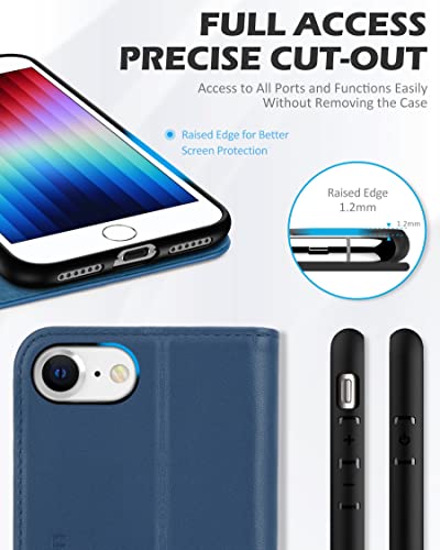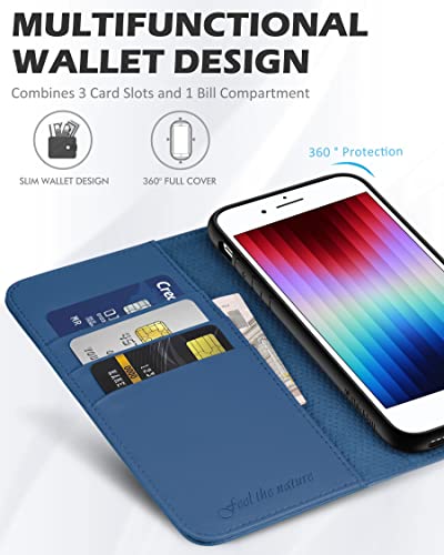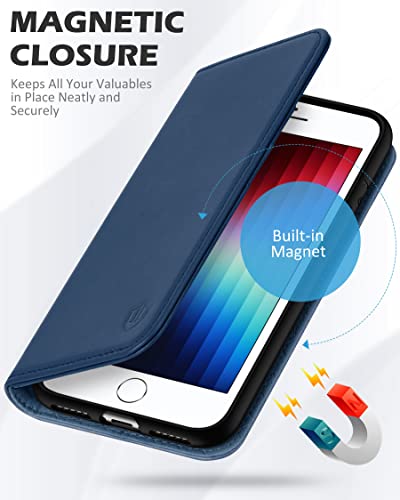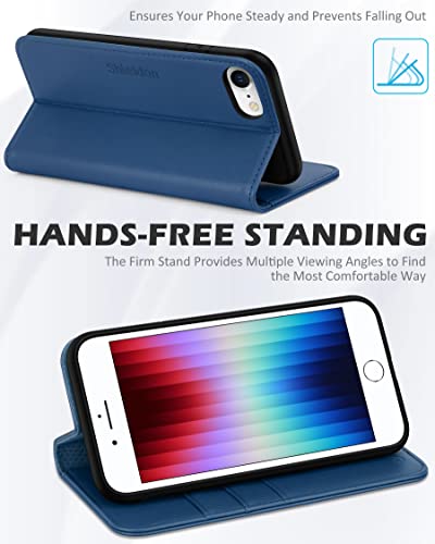 SHIELDON Custodia per iPhone SE 2022, Phone SE 2020, Cover per iPhone 8, per iPhone 7, Vera Pelle Portafoglio Cover Cavalletto Slot Schede Chiusura Magnetica per iPhone SE3/SE2/8/7, Blu Reale