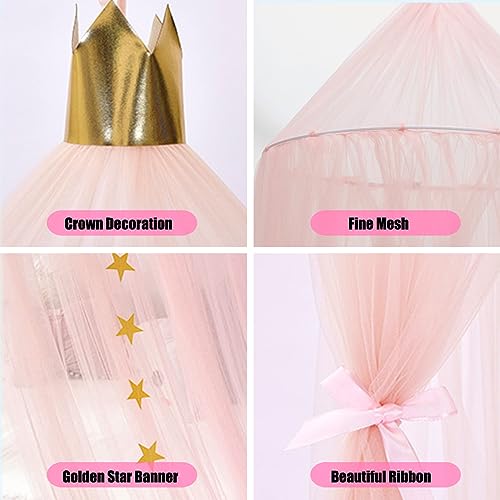SHIKUN Baldacchino a cupola tondo con corona e stella Banner e stelle String Lights Zanzariera per bambini Tenda per bambini Tenda per bambini, Ragazzi, Lettino, Rosa