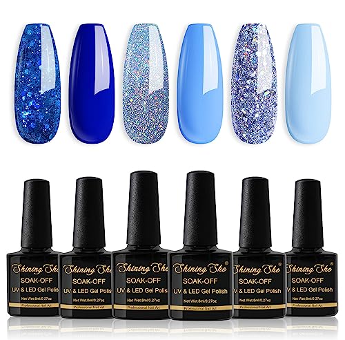 Shining She Smalto Semipermanente Blu,6 Colori Serie Oceanica Azzurro Zaffiro Glitter Soak-Off UV Smalto Unghie per Novizia Nail Art DIY,8ml
