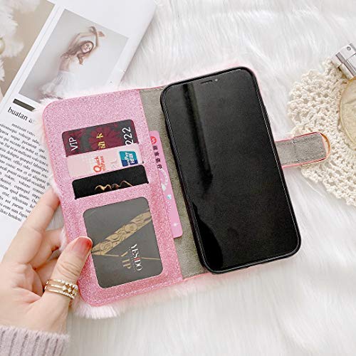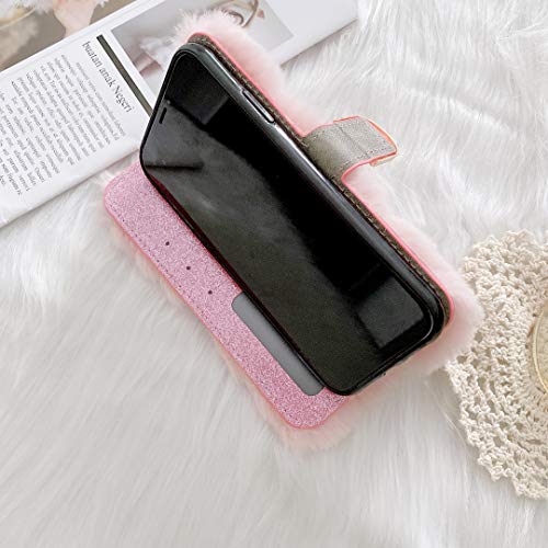 Shinyzone Custodia Compatibile con iPhone 12 PRO Max 6.7 Pollici,Portafoglio in Peluche Pelosa Pelliccia di Coniglio Faux Peloso Soffice Carino Flip Supporto Cover Protettiva,Rosa