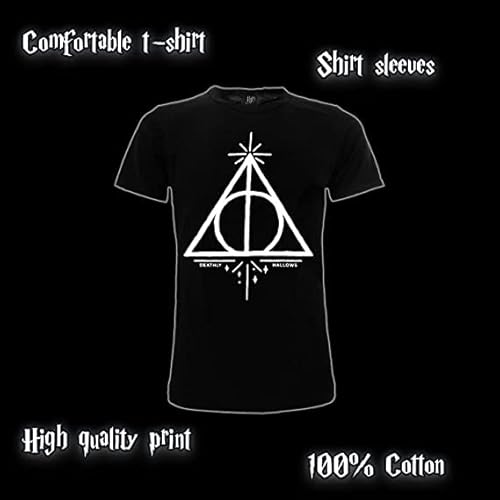 T Shirt Harry Potter Ufficiale Logo Doni della Morte. Colore Nero con Dettagli di Colore Bianco. 100% Cotone. Maniche Corte. Prodotto su Licenza. Unisex. Taglie da Adulto e Bambino. (9-11 Anni)
