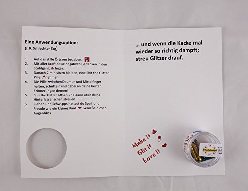 Dimensioni: circa 11 x 17 cm. Colore: misto. Contenuto: circa 5 pillole glitterate