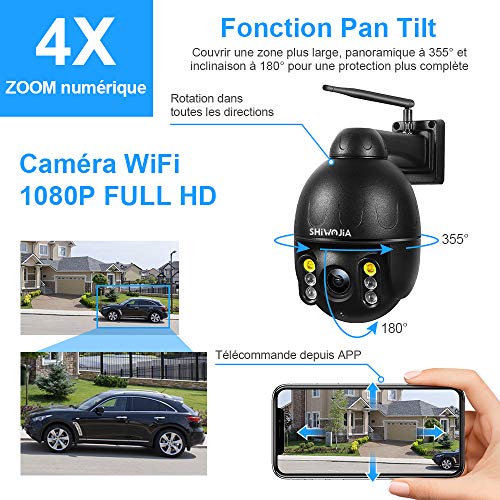 SHIWOJIA Telecamera di Sorveglianza IP PTZ Dome,1080P WiFi Esterno Senza Fli Telecamera, Visione Notturna, Audio a 2 Vie, IP66 Impermeabile Scocca in Metallo, Tracciamento Automatico(Nero)