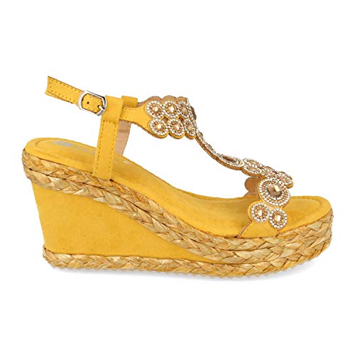 Shoes&blues.es 58188-Sandalo con Zeppa da Donna, Comodo, con Strass sul Collo del Piede, Foderato con sparto e Chiusura con Fibbia, Primavera Estate 2021. Taglia 38 Amarillo