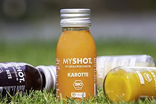 MYSHOT è composto da superfoods altamente concentrati e ricchi di vitamine: 20 % di succo di carota, 30 % di succo di olivello spinoso e 50 % di succo d'arancia. Con i suoi 60 ml, è due volte più grande degli shot normali. Non c'è modo più efficace ed efficiente per coprire il tuo fabbisogno quotidiano di sostanze vitali.