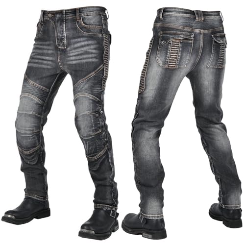 MATERIALE: denim elasticizzato di alta qualità, 95% cotone + 5% fibre elastiche. Resistente all'usura, antistrappo, antivento e traspirante, morbido e confortevole. Adatto a tutte le stagioni. Con tessuto resistente agli strappi sulle ginocchia per mantenerti sicuro, protetto e comodo durante la guida. Con i jeans da moto puoi avere un bell'aspetto e stare comunque al sicuro. Confezione: 1 pantalone da motociclista + 2 ginocchiere + 2 imbottiture per i fianchi.