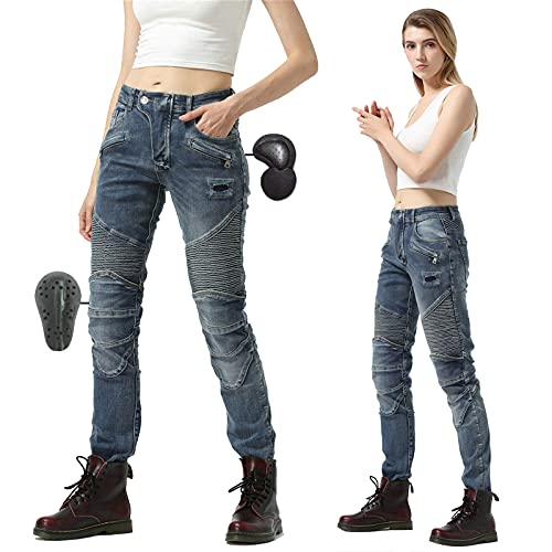 SHUOJIA Pantaloni Da Moto, Per Donna, Jeans In Denim Per Motociclismo Con Armatura E 4 Ginocchiere (Blue,XXS)