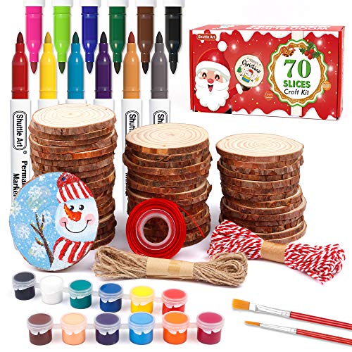 KIT FETTE DI LEGNO CON CORTECCIA DI VALORE: il kit fette di legno con corteccia di Shuttle Art contiene quasi tutto il necessario per creare decorazioni in legno per le vacanze, tra cui 70 pezzi di legno preforati, 2 set da 12 colori di vernice acrilica, 4 pennelli, 12 pennarelli permanenti colorati, 5 adesivi con disegni diversi, filo di iuta, nastro rosso e altro ancora, kit di artigianato di legno completo per bambini e adulti.