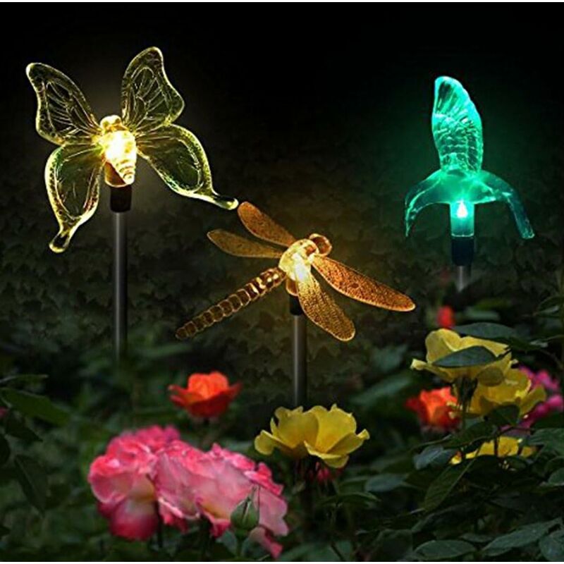7 colori cangianti sulla parte superiore dell'asta. È perfetto per interni ed esterni senza alcuna preoccupazione di umidità, maltempo o cortocircuito. Luce a LED che cambia colore: set di 3 luci da giardino a energia solare con farfalla, libellula e colibrì con 7 LED Cambio di colore. Hanno un gradiente;