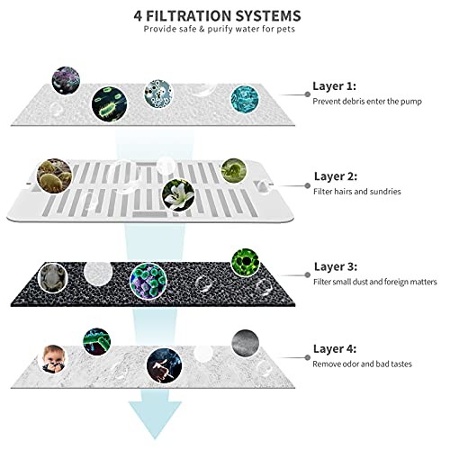 【Sistema di Filtri Quadrupli】:Ogni filtro è composto da spugna, tampone di poliestere, carbone di alta qualità e resina a scambio ionico. Il sistema di filtrazione offre acqua sana per i tuoi animali domestici.