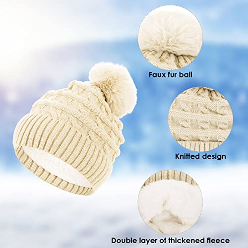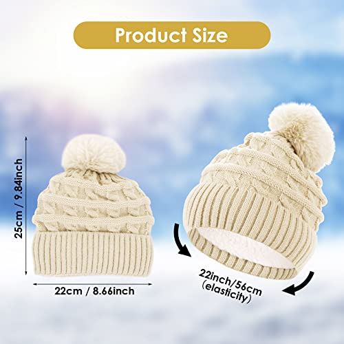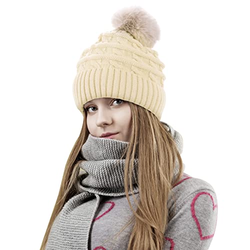 Sibba Berretto invernale da donna, foderato in pile termico, lavorato a maglia, con pompon in pelliccia sintetica, bianco, Taglia unica