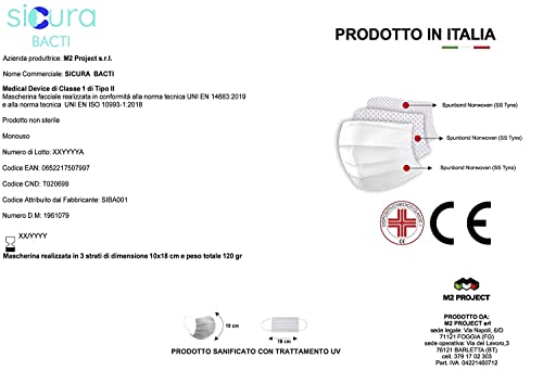 Sicura Bacti Mascherine Chirurgiche Certificate Made in Italy, Mascherine Chirurgiche protettive monouso per adulti 50pz