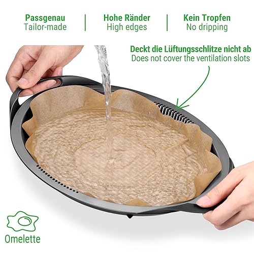 ♻️【Design pratico】 I bordi rialzati e alti impediscono all'acqua e all'olio di fuoriuscire e gocciolare durante la preparazione di cibi ricchi di liquidi come una frittata. Le tacche sui lati mantengono aperti i fori di ventilazione in modo che il vapore possa circolare liberamente nel contenitore del Varoma.