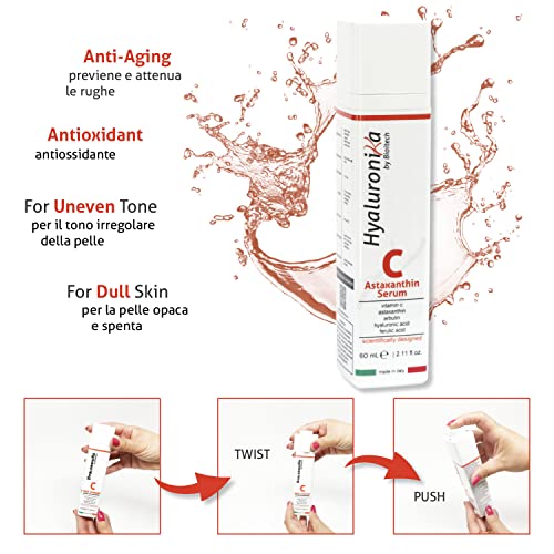 Siero viso con Vitamina C e Acido ialuronico, potenziato con Astaxantina, 1000 volte più efficace dimostrato scientificamente. Antiossidante, Antietà e contro le macchie cutanee. Made in Italy.