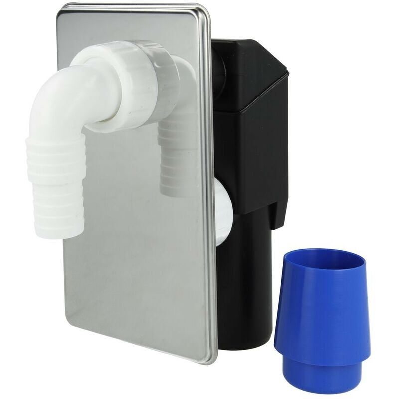 Il sifone da incasso dn 40/50 è adatto per lavatrice e lavastoviglie. Ha un'apertura di pulizia e un rosace parete di 150 x 85 mm. Connessione: Con attacco tubo 1 Uscita: D