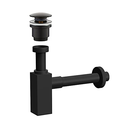 Sifone lavabo Bagno Nero Opaco, Completo di piletta Click clack, Attacco Universale (Quadrato)