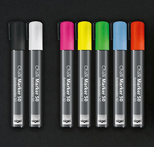 Un Mercatore a gesso liquido con punto rotonda, per tratti da 1-2 mm e un mercatore a gesso liquido con punta scalpello, per tratti da 1-5 mm