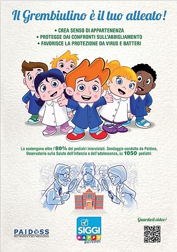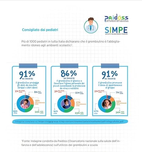 Consigliato dai pediatri - Più di 1000 pediatri in tutta Italia dichiarano che è l'abbigliamento idoneo agli ambienti scolastici. Crea senso di appartenenza, protegge dai confronti sull'abbigliamento e favorisce la protezione da virus e batteri.