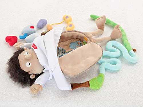 Bambola di pezza maschile morbida nel camice del paziente, parte superiore del corpo apribile con organi rimovibili in peluche colorato, paziente Erwin - ideale per bambini piccoli per imparare, coccolare e giocare