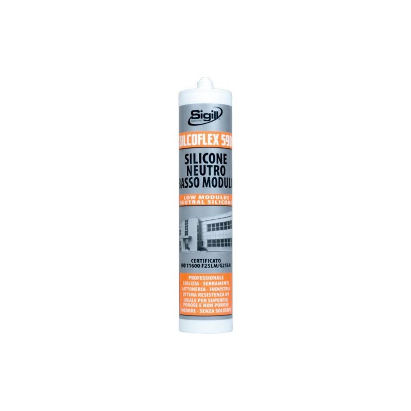 Sigill silcoflex 590 sigillante siliconico monocomponente a basso modulo a reticolazione neutra alcoxy per applicazioni in interni ed esterni. Polimerizza a temperatura ambiente sotto l'azione dell'umidita' atmosferica per fornire un elastomero siliconico permanentemente flessibile. Il prodotto presente eccezionali caratteristiche di lavorabilita', adesione a vari substrati e permette di realizzare un elastico sigillante per finiture perimetrali, vetrate e applicazioni nell'edilizia in aree ad alta umidita', come locali bagno. CAMPI DI APPLICAZIONE: Sigillatura di giunti su finestre e porte in legno, metallo e plastica. Sigillatura di giunti su pareti, facciate e costruzioni metalliche. Adatto per sigillare vetrate. Idoneo per giunti nelle zone bagno. CARATTERISTICHE: - Reticolazione e formazioni pelle veloci. - Adesione senza primer alla maggior parte dei materiali. - Non corrosivo per metalli. - Adatto a substrati alcalini come calcestruzzo, malta, cemento fibroso. - Contiene
