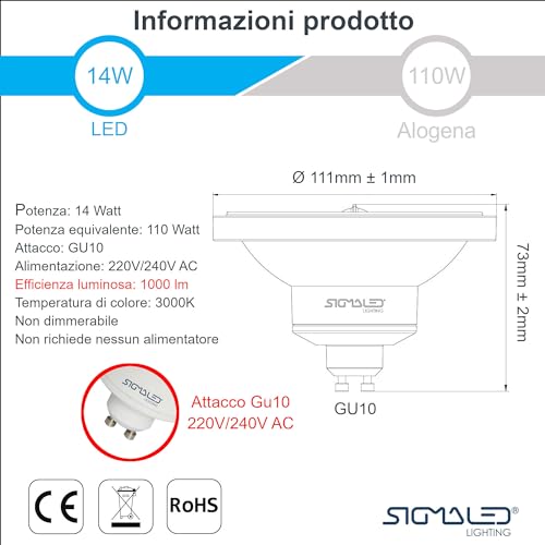 Sigmaled lighting - Faretto LED AR111 GU10 14W (equivalente 110W alogena) - 220V/240V AC - Luce Calda 3000K - 1000 lumen - Spot LED AR111 - 5 Unità