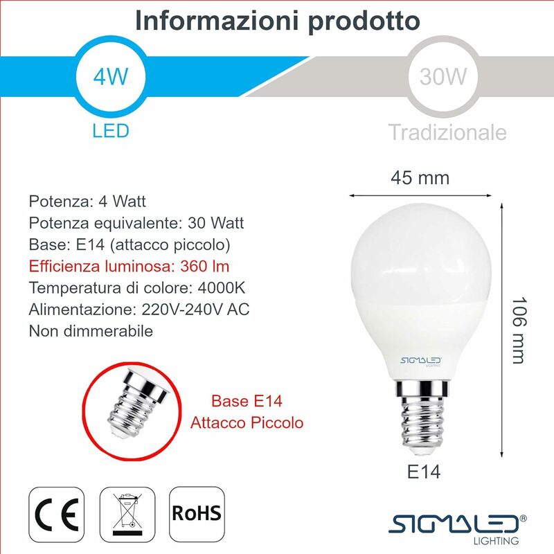 RISPARMIO ENERGETICO: Lampadina led 6W G45 con attacco E14 SIGMALED LIGHTING eqivalente a una lampadina tradizionale da 45W, garantisce un risparmio dell'85% rispetto alle lampadine tradizionali. NON DIMMERABILE. CONFEZIONE da 6 lampadine. QUALITA' DELLA LUCE: lampadine led 6W luce bianca naturale 4000K SIGMALED Lighting, per chi cerca una tonalità di luce più bianca di quella ad incandescenza. Con un CRI indice di resa dei colori maggiore di 80 rende i colori nitidi e reali CRI>80. Grazie al fascio ampio di 220° illumineranno perfettamnte i vostri ambienti. DIMENSIONI: Le lampadine led globo / sfera P45 hanno una dimensione di 45x80mm. Le dimensioni compatte le rendono adatta ad ogni tipo di utilizzo. Lampadine led facilissime da installare con attacco grande E14 possono essere usate in sostituzione di tutte le lampadine con base E14 nota come attacco EDISON E14. EFFICIENZA ENERGETICA: Il 1° settembre 2021 è entrata in vigore una nuova classificazione di efficienza energetica la