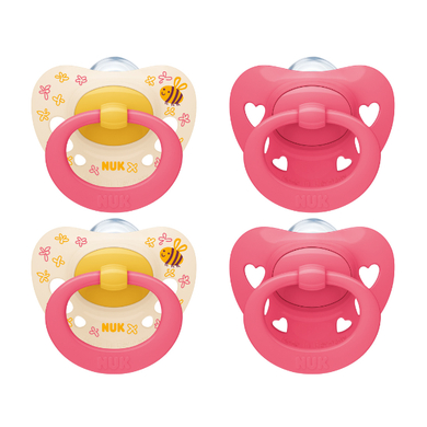 Dettagli prodotto: Età: da 18 a 36 mesi, taglia 3 Tettarella facile da masticare Bocca a forma di cuore child Riduce la pressione sulla mascella e sui denti grazie al collo della tettarella stretto e sottile La tettarella piatta lascia più spazio ai movimenti naturali di suzione del bambino. Design giallo/rosa Materiale e dimensioni: Tettarella: silicone Istruzioni per la conservazione e la cura: Pulire il ciuccio con un detergente delicato prima di ogni utilizzo. Si raccomanda di sostituire il ciuccio dopo 4 mesi di utilizzo. Sostituire immediatamente il ciuccio in caso di segni di usura. Incluso nella consegna: 4 x manichino