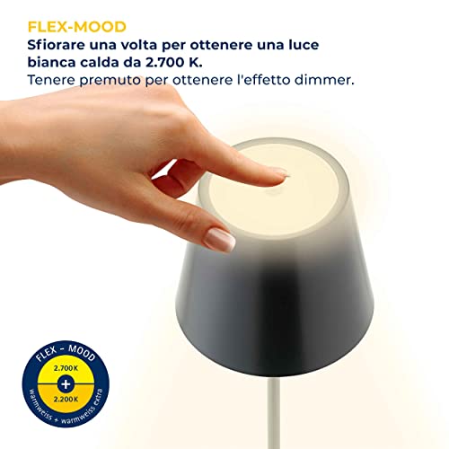 FACILE DA USARE: basta solo un dito e la lampada si può accendere o spegnere senza problemi ed è dimmerabile con l'interruttore dimmer a sfioramento. La funzione Flex-Mood fornisce inoltre una luce bianca calda e non abbagliante in 2 temperature di colore (2.700 K e 2.200 K), creando la giusta atmosfera in qualsiasi momento, anche come lampada notturna e da lettura.