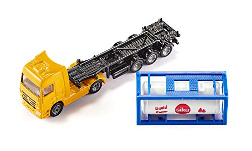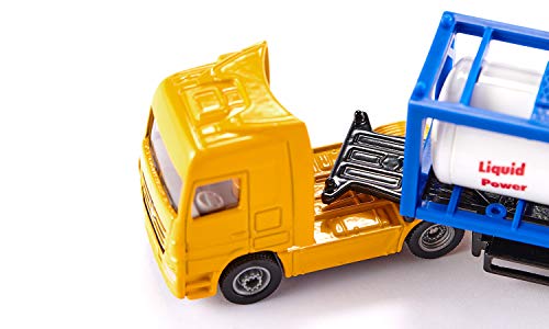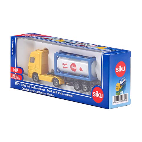 Contenuto: 1 siku 1795, Camion con container cisterna, Scala 1:87, Materiale: Metallo/Plastica, Dimensioni: 14,5x3x4,8 cm, Peso: 0,129 kg, Colore: Giallo/Blu, Linea: SIKU Super