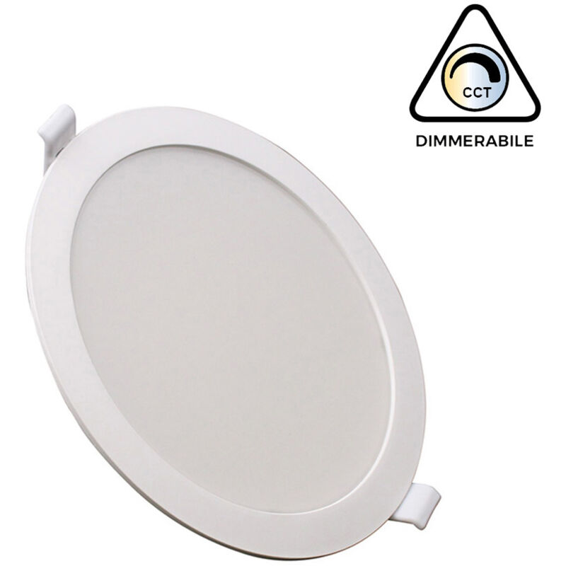 FARETTO INCASSO LED 24W 220V DIAMETRO 225 MM CCT 3000K-4200K-6400K DIMMERABILE Il faretto led da incasso rotondo dimmerabile 24W con un design semplice, ma moderno. La luce emessa è distribuita in un fascio luminoso di 120°, è ideale per un utilizzo sia commerciale, che domestico, grazie al suo diffusore opalescente che non produce abbagliamenti alla vista. La lampada produce una luminosità di circa 2700 Lumens, equivalente a circa 240W di una lampada tradizionale (alogena). E' fabbricato in PVC di alta qualità, che contribuisce a rendere minima l'emissione del calore e a migliorare la vita media. Il faretto sul retro possiede uno SWITCH o meglio un pulsante con il quale è possibile variare la tonalità di luce: 3000k-4200k-6400k. Il faretto funziona direttamente alla rete elettrica 220V, e l'installazione è molto semplice, essendo fornito con due mollette di ritegno, ciò consente di fissare facilmente il faretto al soffitto in cartongesso. CARATTERISTICHE TECNICHE: Marchio Tensione di