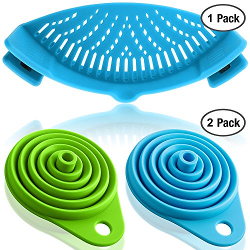Silicone Snap Filtro con 2 Pieghevoli Imbuti, FineGood Mani Libere Calore Clip-on Resistente Colander Beccuccio per Pasta Verdure Tagliatelle Piatto Ciotola Pan - Blu