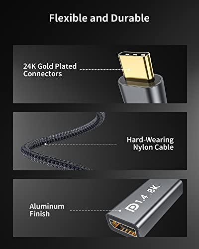 【DP1.4 supporta risoluzioni UHD 8K@60Hz】- L'adattatore da USB-C a Displayport 8K HDR supporta fino a 7680x4320, retrocompatibile con risoluzioni 4K a 1080p. Nessuna esperienza di gioco tremolante con 144Hz e 240Hz. L'adattatore USB-C Displayport supporta Multi-Stream (MST) per il collegamento in serie di più monitor, nonché audio accurato per una gamma completa di tipi di audio tra cui SACD, DVD-Audio, DTS-HD Master Audio e Dolby TrueHD.