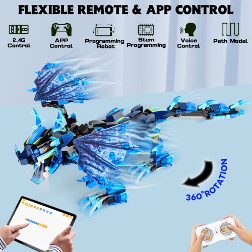 Telecomando per telefono e controllo app: i giocattoli da costruzione del drago Sillbird possono essere controllati non solo da un telecomando da 2,4 Ghz (la distanza massima è di 20 m), ma anche tramite la connessione Bluetooth dell'app del telefono cellulare. Ha modalità di controllo remoto, modalità percorso, controllo vocale, programmazione STEM e rilevamento gravità, che è semplice e facile da usare. Robot può muoversi in tutte le direzioni all'interno o all'aperto, tra cui sinistra, destra, avanti, indietro e acrobazie rotanti a 360 gradi.
