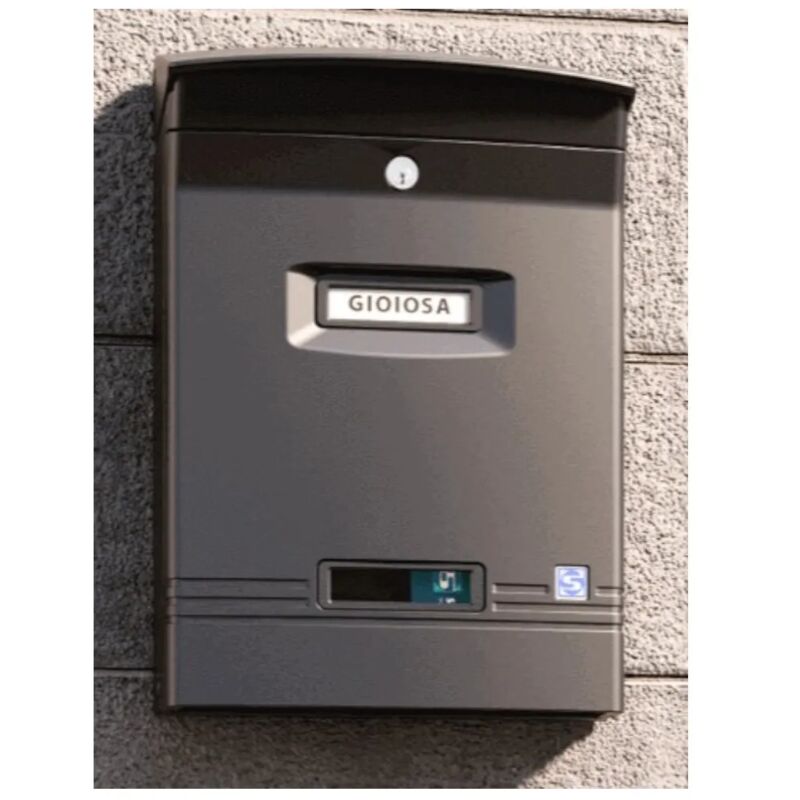 Cassetta postale singola formato rivista in alluminio pressofuso verniciato grigio ferro. Dimensioni l.258 h.375 p.85-120. Con tetto parapioggia, imbucalettere dall'alto (apertura mm.230x30) ritiro posta dal frontale.