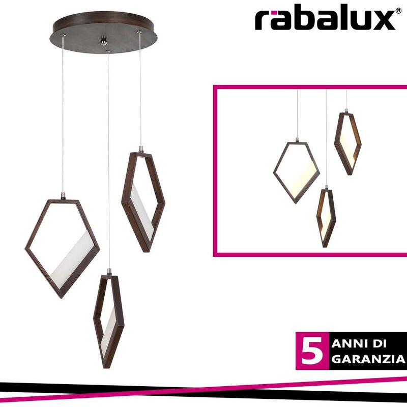 Pendente stile moderno .La tripla sospensione pentagonale Silvana in stile minimalista sar un aggiunta spettacolare al tuo soggiorno moderno. La lampada dotata di una base rotonda e decorativa, realizzata in metallo e vetro, il suo corpo marrone metallizzato e la sua luce LED integrata a risparmio energetico ricoperta da un vetro opalino. Il consumo energetico delle sorgenti luminose di classe energetica A di 45 W, la loro intensit luminosa di 3600 lumen e la loro durata di 30.000 ore. La loro temperatura di colore di 3000 K, quindi emettono una luce bianca calda, creando un atmosfera intima e intima nella stanza. Il diametro della sospensione tripla Silvana è di 370 mm e la sua distanza dal soffitto è di 1200 mm. Questo modello viene fornito con una garanzia di 5 anni.CARATTERISTICHE DEL PRODOTTO:categoria di prodotto=Illuminazione interna:Tipo=Pendenti:Stile=Minimo:Camera=soggiorno:Temperatura colore=bianco caldo:Flusso luminoso della sorgente luminosa (lm)=3600:Specifiche