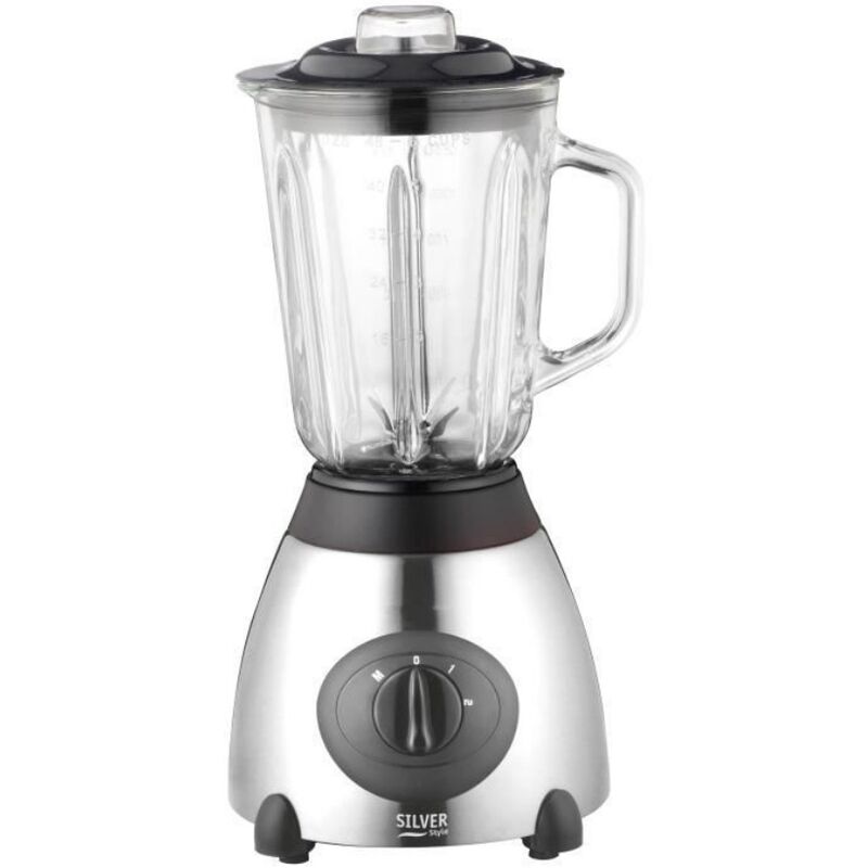 Frullatore Silver Style 000097 in acciaio inox e ciotola in vetro. Ciotola: vetro. Capacità: 1,5 litri. 2 velocità e pulsazioni. Coperchio con sicurezza. Piedini antiscivolo. Dim Master Cartone (cm): 34 x 49 x 39. Potenza: 500 W. Voltaggio: 230V. Colori: acciaio inossidabile.