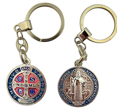 Silver Tone Blue and Red Enamel Saint Benedict Medal Keychain, 3 3/4 Inch by Religious Gifts