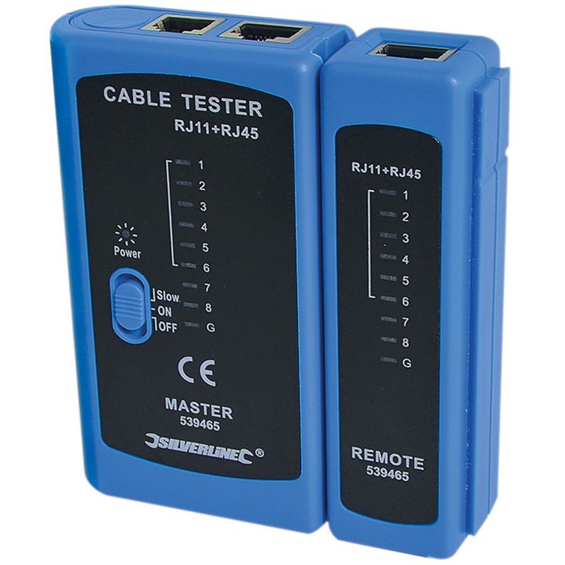 Connessioni adatto per cavi RJ11 e RJ45 Doppia velocità Matrici e scatola di montaggio remoto Richiede 1 batteria (PP3) x 9V Hand-held tester has connections suited for RJ11 and RJ45 cables. Twin speed. Master and remote box. Requires 1 x 9V battery (not included).