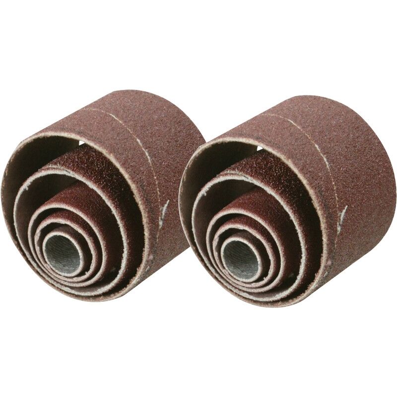 Contains 2 x 13mm, 2 x 19mm, 2 x 25mm, 2 x 38mm and 2 x 50mm sanding drum belts. Contiene nastri per tamburi di levigatura: 2 x 13 mm, 2 x 19 mm, 2 x 25 mm, 2 x 38 mm e 2 x 50 mm Metodo di costruzione: tessuto, resina, ossido di alluminio Tipo di grano: ossido di alluminio Tipo di articolazione: spirale incollata