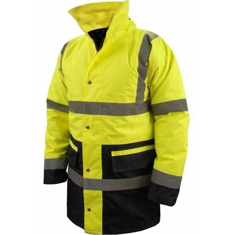 Poliestere bicolore con rivestimento in poliuretano Cuciture nastrate per una maggiore impermeabilità Fodera trapuntata, cappuccio a scomparsa e zip a doppia direzione altamente resistente Misure: XL 108-116 cm Conforme alla EN471 Classe 3 Polyester 2-tone PU coated. Reflective body, shoulder and arm bands. Stitched and taped waterproof seams, quilted lining, fold-away hood and heavy duty 2-way zip. Conforms to EN471 Class 3.