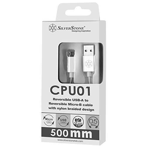 Silverstone SST-CPU01S-500 - Cavo Reversibile USB, Type-A to Micro B in Nylon a Lunga Durata, High Speed Charge e Data SYNC, Compatibile Android, 0.5m, Argento