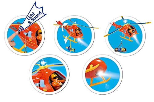 Simba Sam, elicottero Wallaby, con personaggio Tom, con suono originale, luce blu, faro di ricerca, verricello a corda, 15 cm, dai 3 anni in su