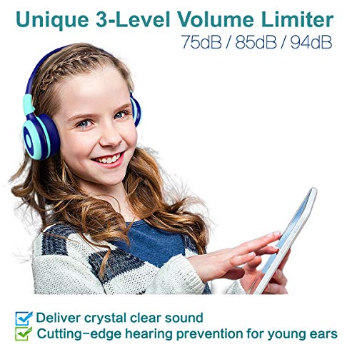 Cuffie Bluetooth per bambini con volume distinto limitato per la protezione dell'udito: Adottare esclusivo proprietario 3 livelli di limitazione del volume (75dB/85dB/94dB) per proteggere le orecchie vulnerabili e sensibili, che si adattano a varie età e ambienti. 2 altoparlanti di qualità superiore forniscono un suono cristallino.