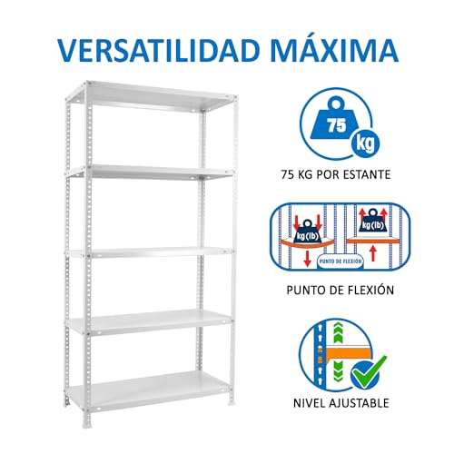 Capacità di carico e misure - La mensola metallica è alta 2000 mm, profondità 1000 mm e larghezza 300 mm e dispone di 5 ripiani. La sua capacità di carico e il punto di flessione è di 75 kg per ripiano, il che significa che quando si rimuove il carico il ripiano recupera la sua forma originale. Questo vantaggio offre una maggiore durata nel tempo e un maggiore godimento dei nostri scaffali.
