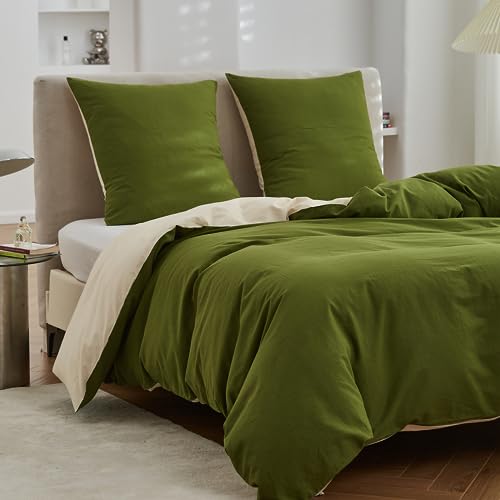 Simple&Opulence Copripiumino Matrimoniale 240x220 cm in Cotone,Biancheria da Letto Reversibile con Cerniera,Set Copripiumino Matrimoniale con 2 Federe 65x65 cm,Verde/Beige